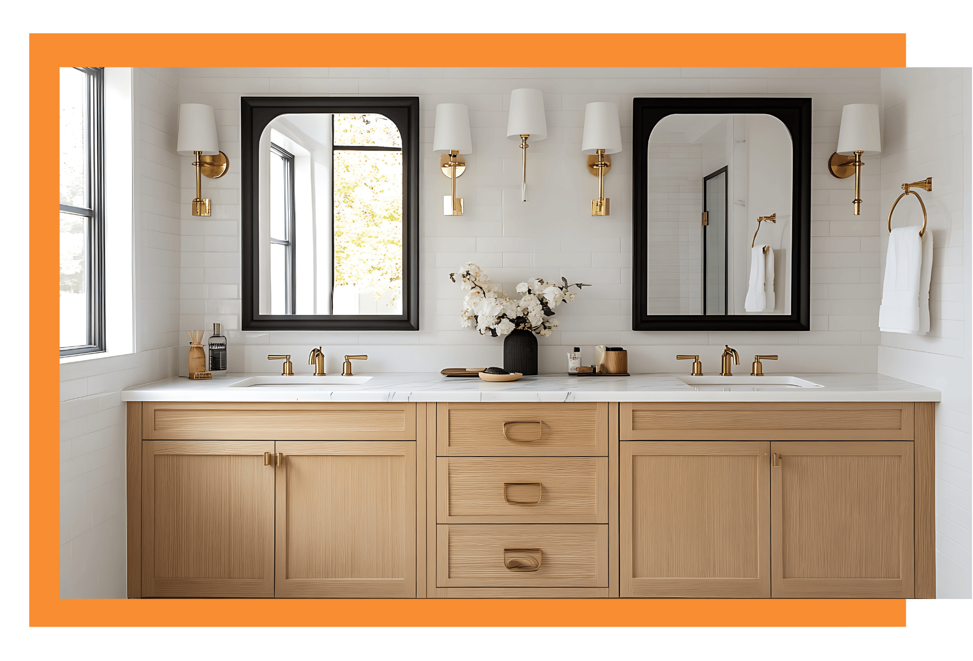 A vanity is the bathroom cabinet unit that holds the sink and provides storage underneath or around it. It typically includes the cabinet base, countertop, sink basin, and space for plumbing connections.