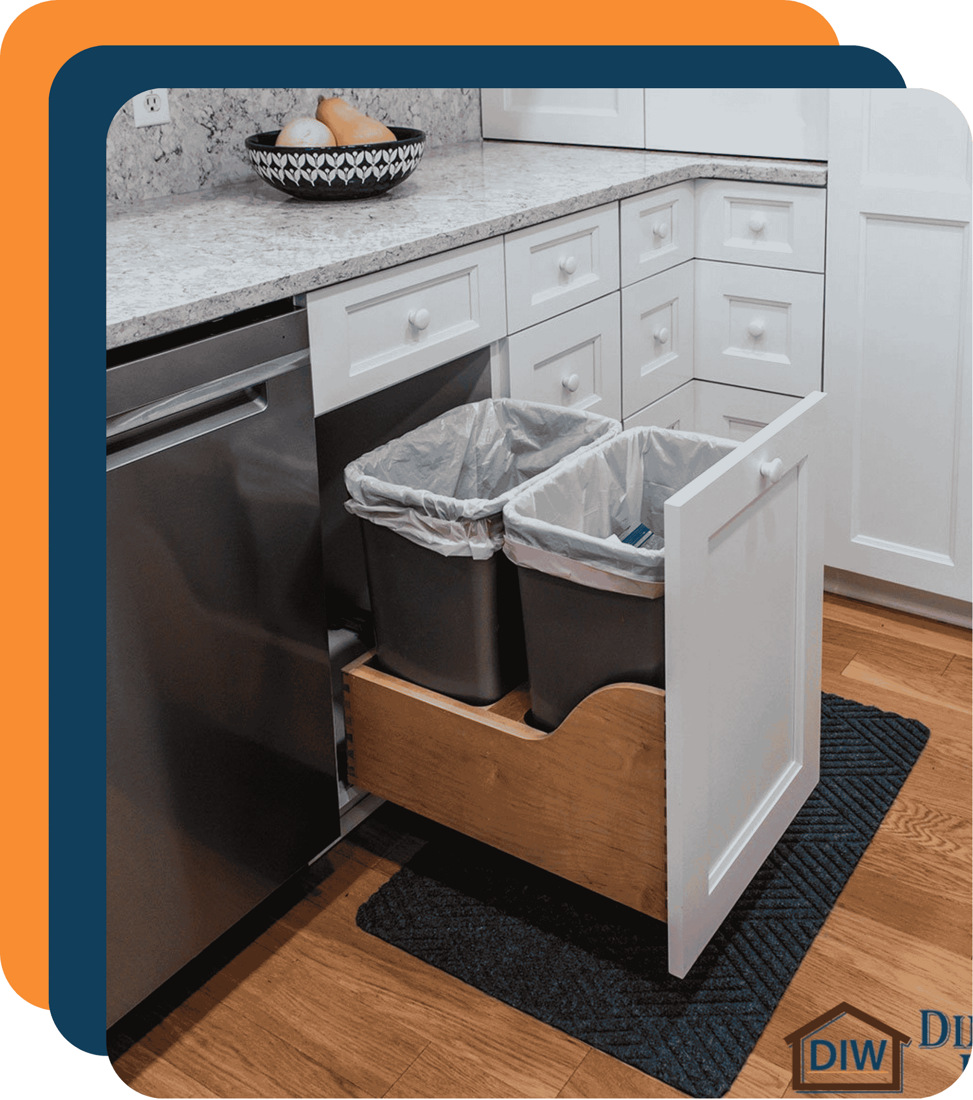 Pull-out trash and recycling cabinets keep waste hidden while making daily cleanup quick and convenient.